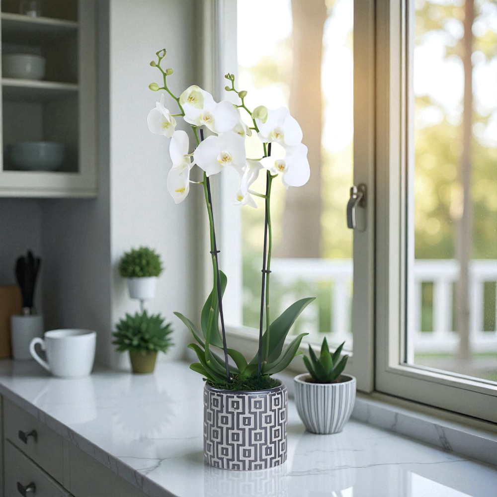 Şık ve estetik kare desenli beton saksı içinde çift dal beyaz orkide, her ortamda dikkat çeken zarif bir hediye alternatifidir.