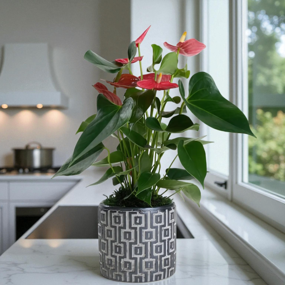 Modern kare desenli saksı içinde sunulan kırmızı antoryum, ev ve ofis dekorasyonunuza zarafet katar. Dayanıklı ve kolay bakım imkanı sunar.