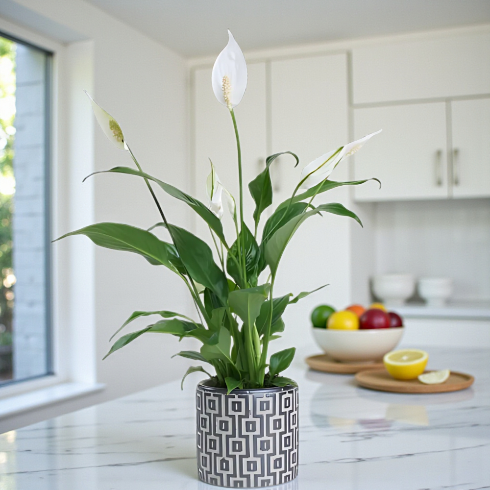 Şık kare desenli saksıda spatifilyum bitkisi, hem iç mekan dekorasyonuna hem de hediye olarak mükemmel bir seçenektir.