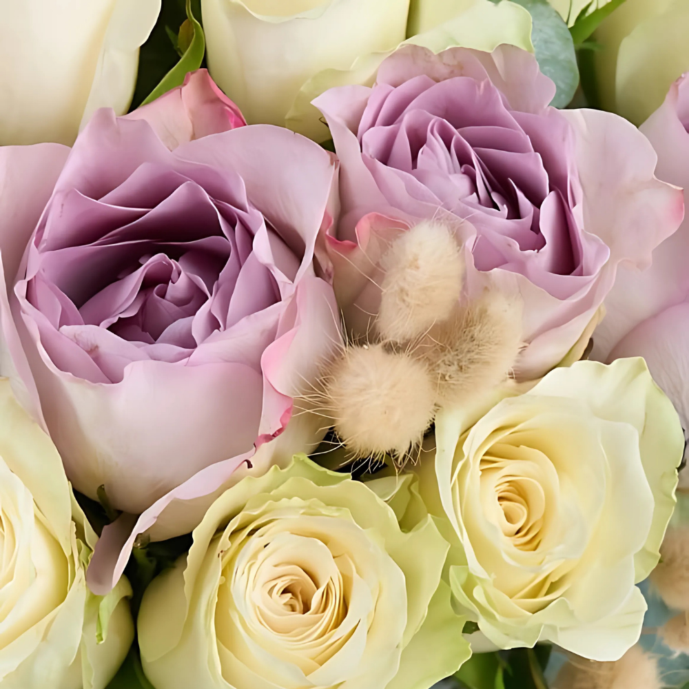 Lila ve beyaz güllerin birleştiği bu yeşil çizgili vazolu aranjman zarif bir görünüm sunar.