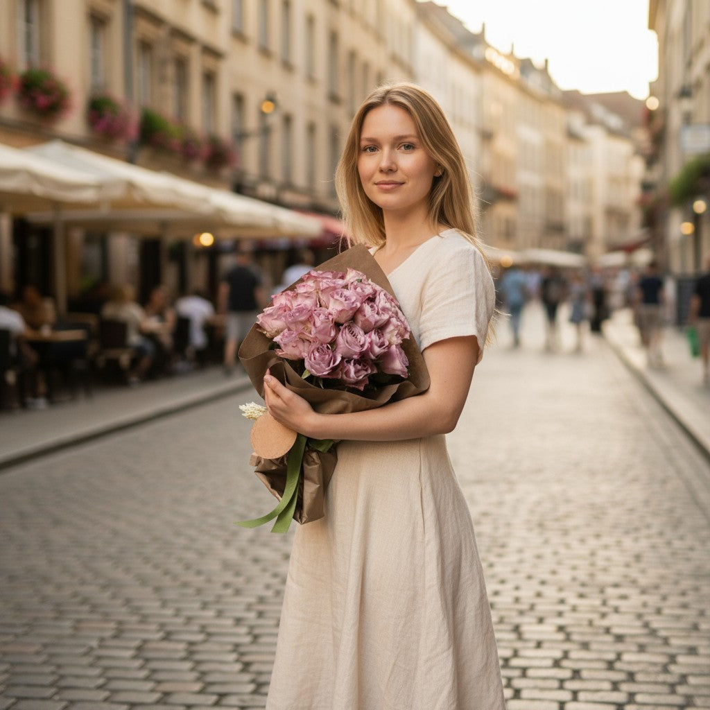 Göz alıcı 21 lila gül, premium kaliteyle hazırlanan zarif bir buket. Şıklığı ve zarafetiyle her özel anı taçlandırır.