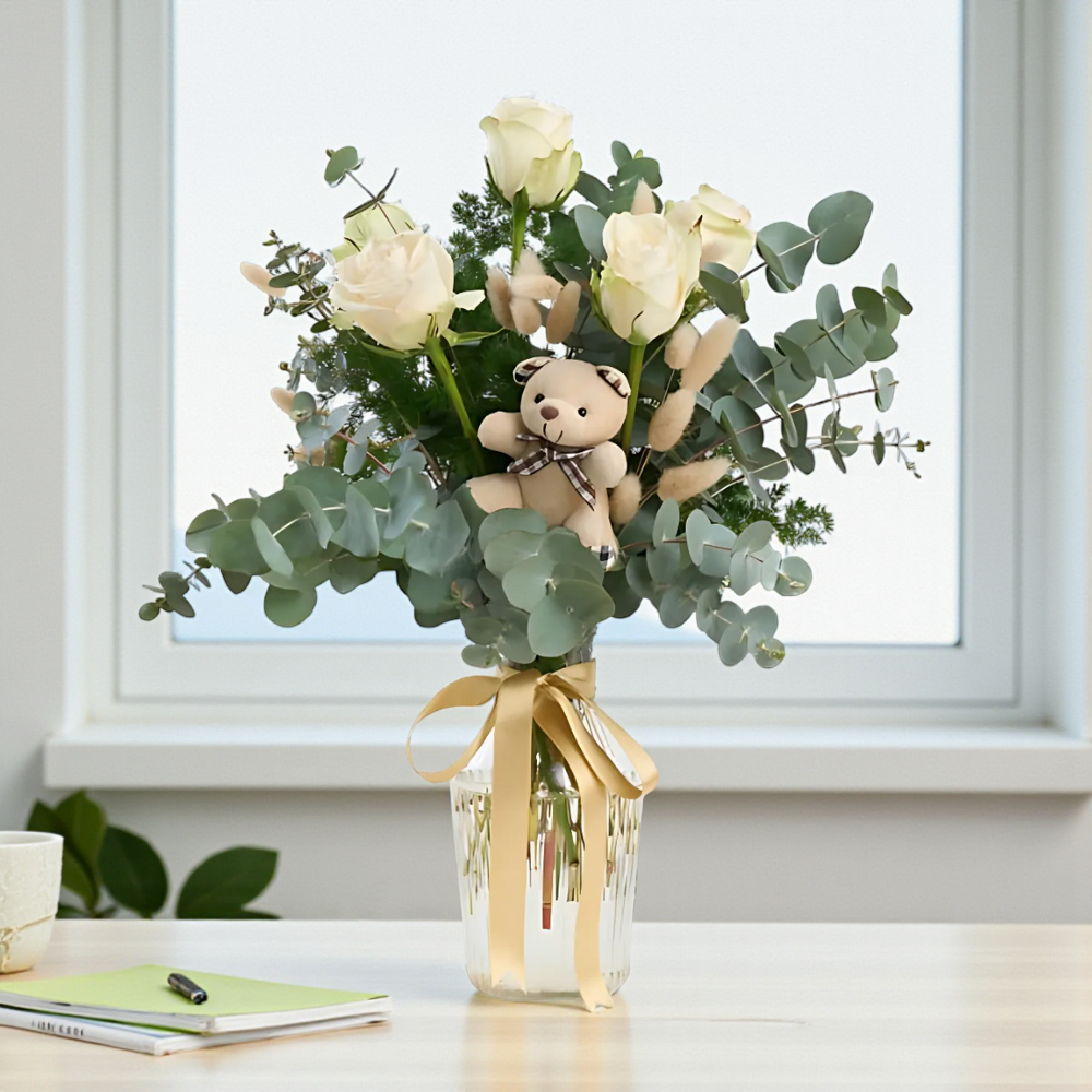 Premium vazoda beyaz güller ve küçük bir ayıcık, saf ve masum duyguları ifade ederken aynı zamanda zarif bir hediye alternatifi oluşturuyor.