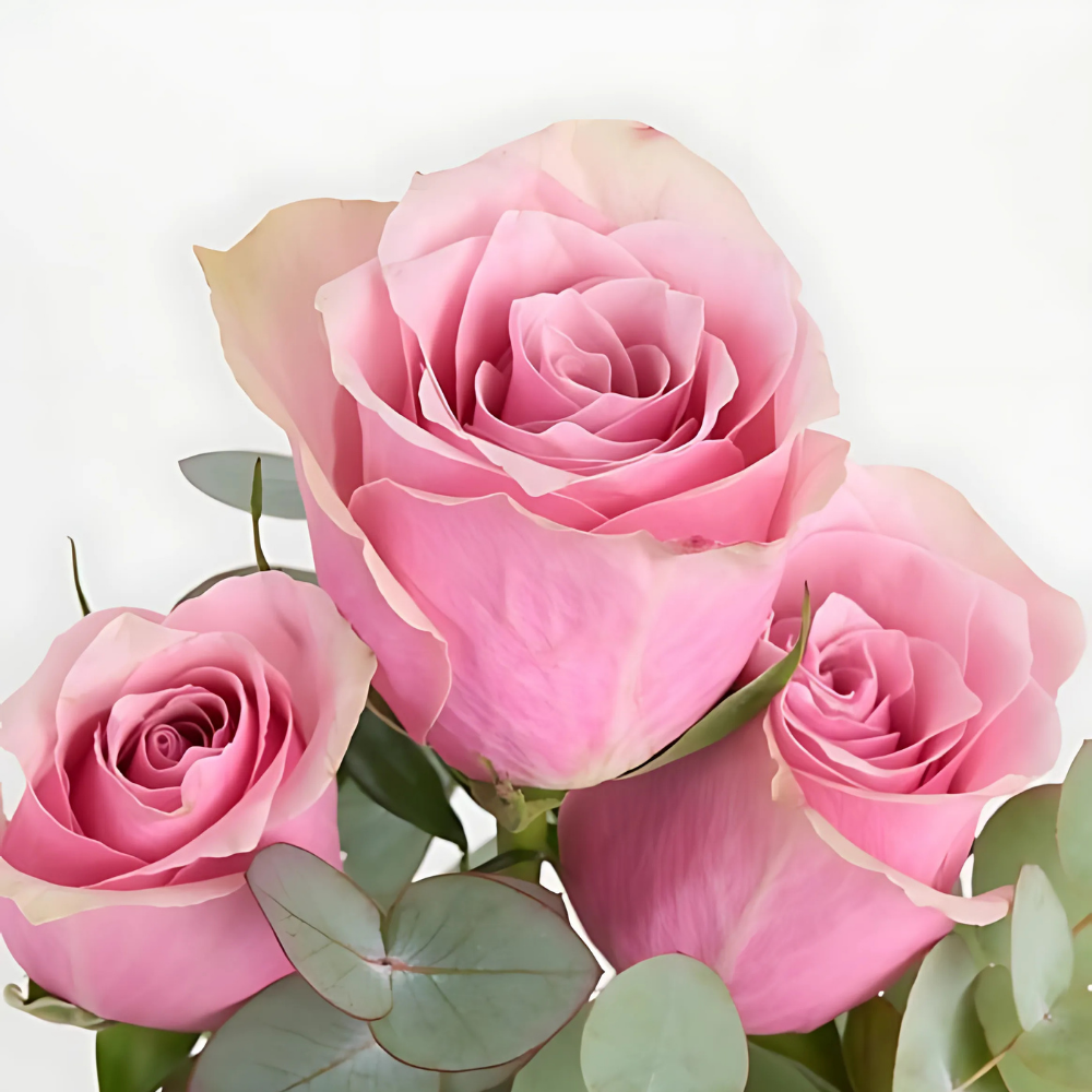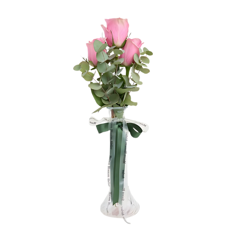 İnce cam vazoda sunulan üç adet pembe gül, sade ve romantik bir atmosfer sunar.