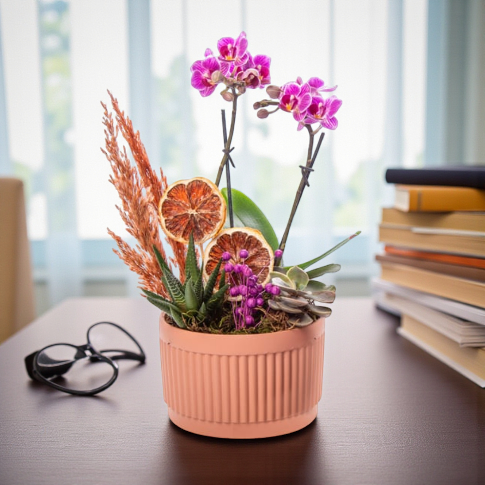 Terra Duo, doğal kiremit saksısı içinde iki dallı mini orkidesiyle hem estetik hem sade bir tasarım sunar. Minimal dokunuşlarla sevdiklerinize zarafet taşır. İç mekânlar için ideal olan bu aranjman, kalıcı bir mutluluk sunar.