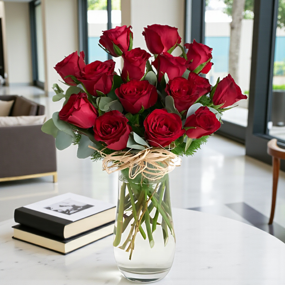 Görkemli 15 adet kırmızı gül, zarif cam vazo içinde sunularak sevginizi ve tutkunuzu en etkileyici şekilde yansıtıyor.