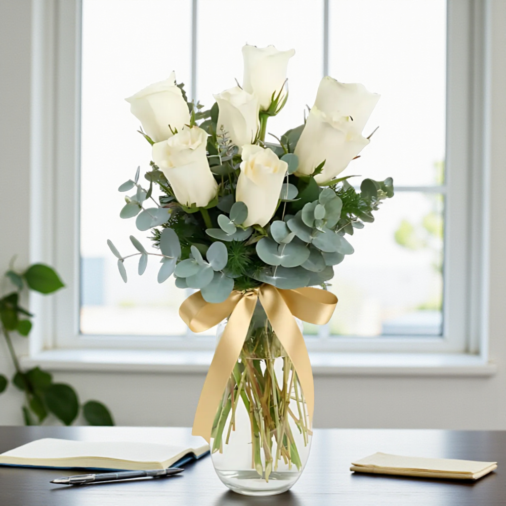 Masumiyetin ve zarafetin simgesi beyaz güller, cam vazo içinde şık bir dokunuş sunarak özel anlarınıza eşlik ediyor.