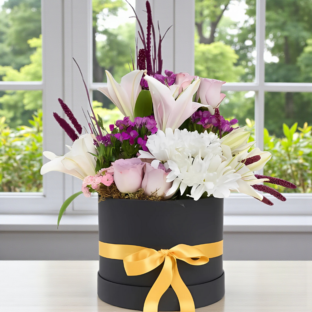Violet Charm – Siyah Kutuda Lila Gül, Pembe Lilyum ve Papatya
